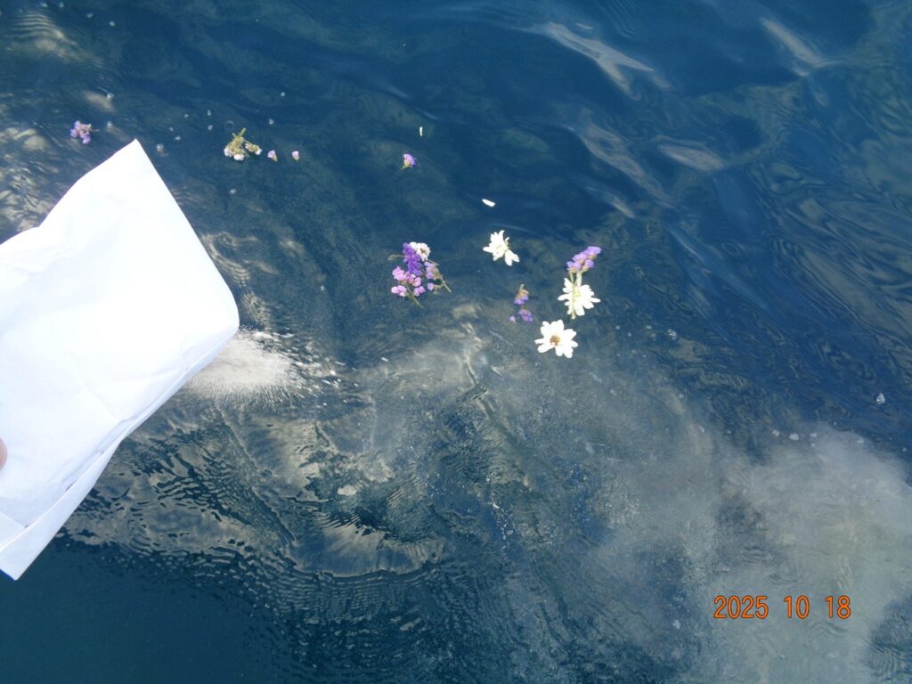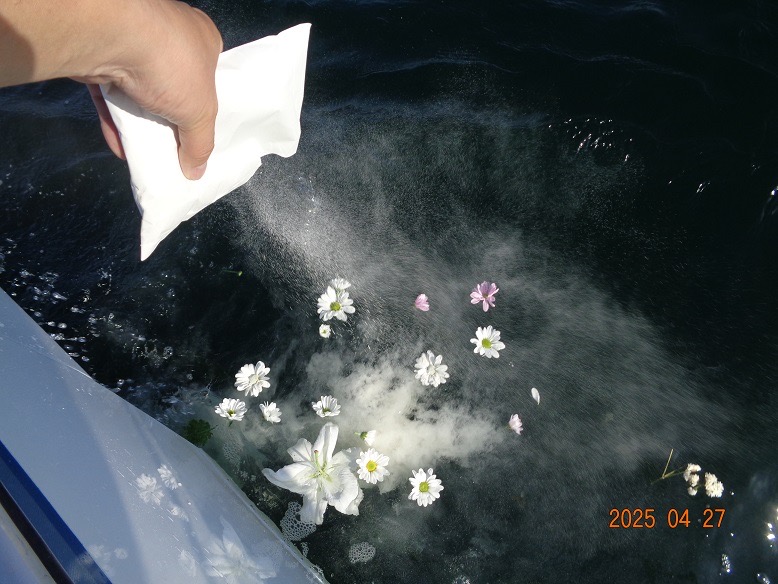 故人様の生きた証である遺灰は、花びらとともに白くゆっくりと海へ広がっていき、やがてまた海の色へと戻っていきます。